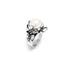 Luminose farfalle si librano nell'aria e incorniciano una brillante perla naturale. Questo anello, delicato e sinuoso, è realizzato a mano attraverso la tecnica della fusione a cera persa. L'argento esalta i riflessi cangianti della perla per un gioiello fatto di luce e equilibrio.