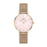 Modello con cinturino in acciaio maglia milano di colore oro rosa, quadrante madreperla rosa con indici e lancette in colorazione oro rosa.