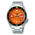 Orologio Seiko della collezione 5 Sports con cassa rotonda in acciaio antigraffio di diametro 42,5 mm e spessore 13,4 mm. Quadrante arancio con indici e lancette in LumiBrite, datario ad ore 3 e vetro minerale Hardilex. Lunetta girevole unidirezionale nera. Cinturino in acciaio con chiusura deployante con pulsante di rilascio. Fondello trasparente e corona, entrambe a vite.